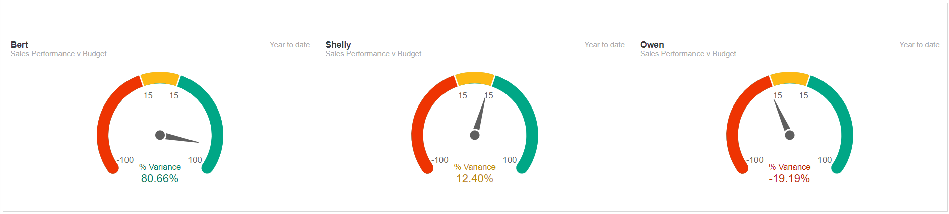 In the Sales database, create a Gauge chart to visualize whether a Sales Rep is tracking against the budget.