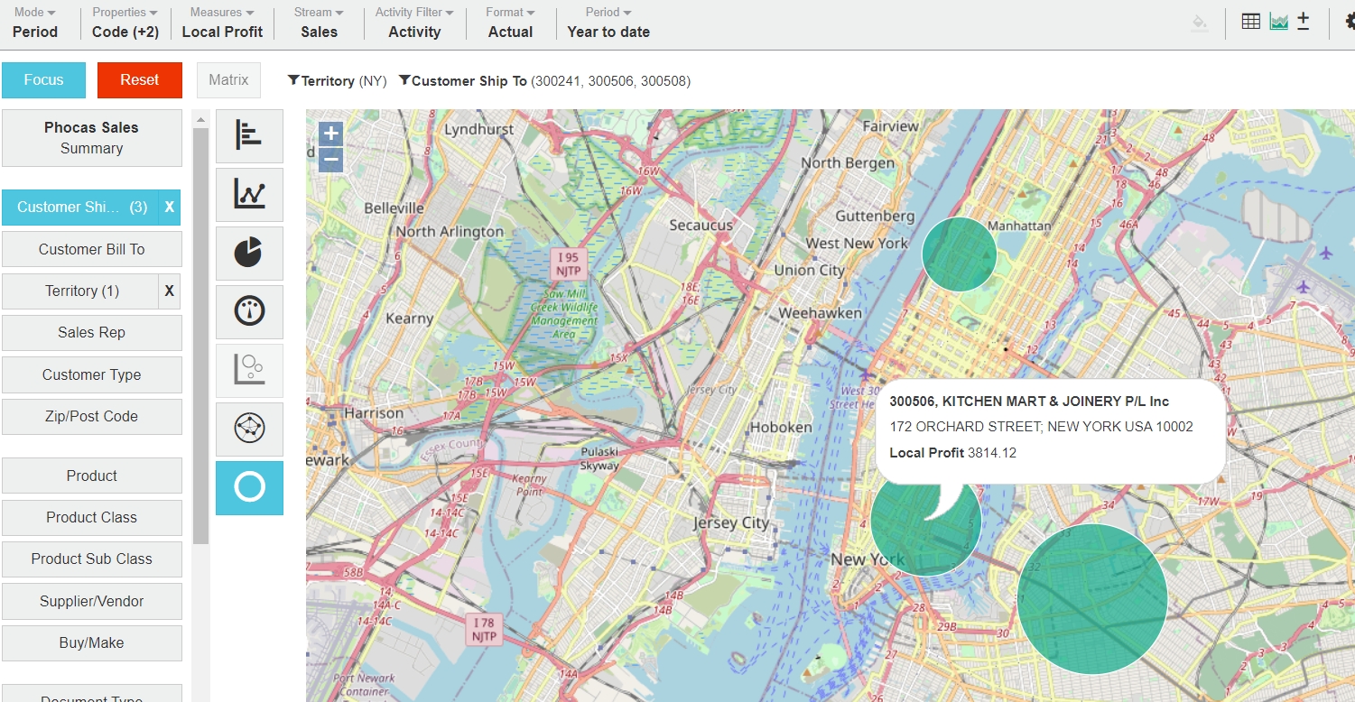 The map displays circles where the top three New York customers are located. The larger the circle, the higher value of that customer. You can click on a circle to view the customer’s details.