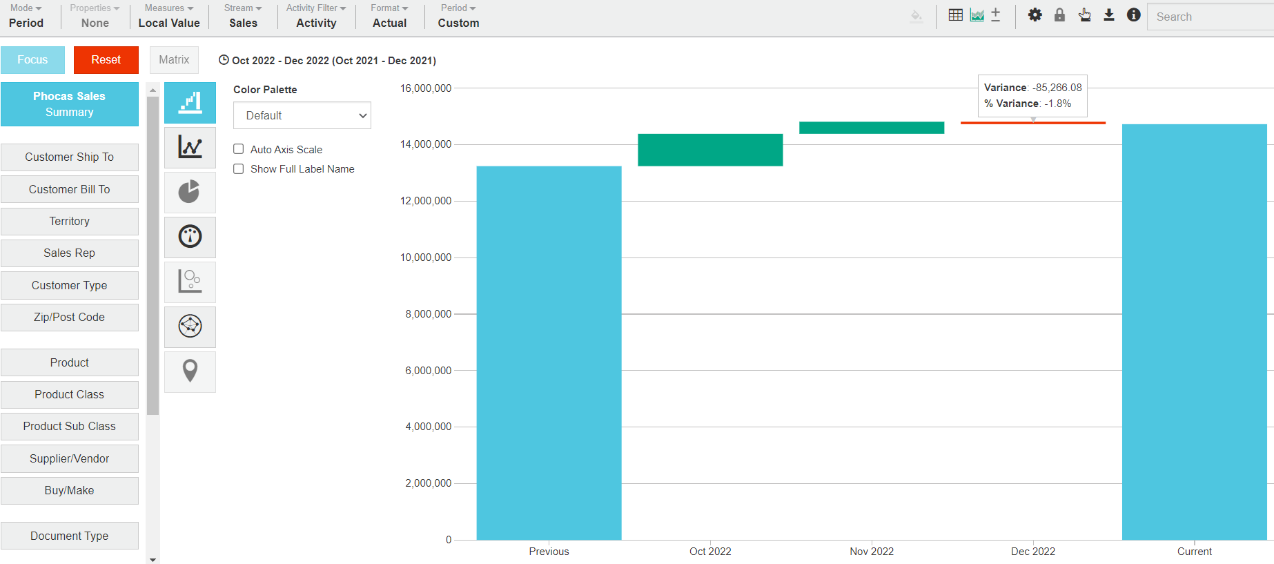 In the Sales database, create a Waterfall chart to get a visual overview of results for the quarter Oct-Dec 2022, compared with the same period in 2021.