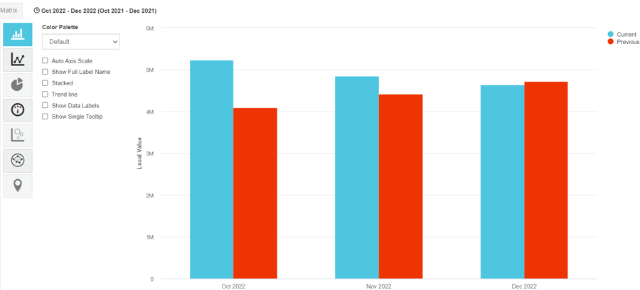 Hover over the columns to view the details. In this example, there was a 1.8% decline in revenue in December.