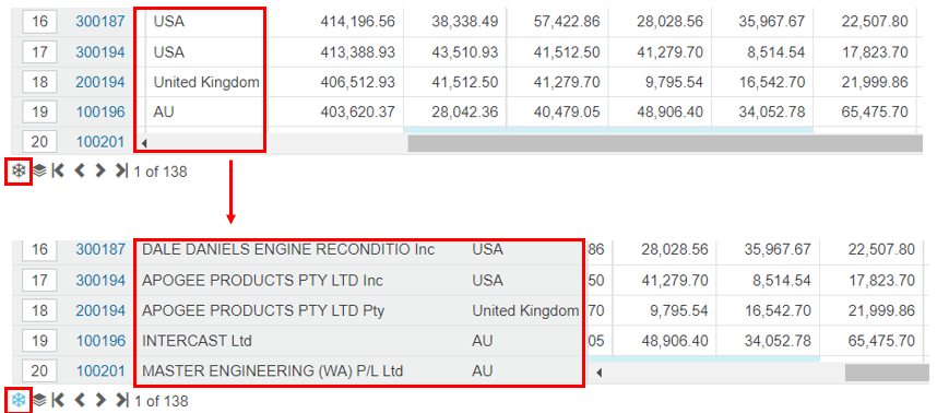 When the grid has a lot of columns, you need to scroll horizontally across the grid to view the far-right columns. When you scroll, the Code property column is always visible but other properties (such as the Name, Country and so on) might become hidden from view. You can freeze the properties columns, so they are always in visible during your analysis.