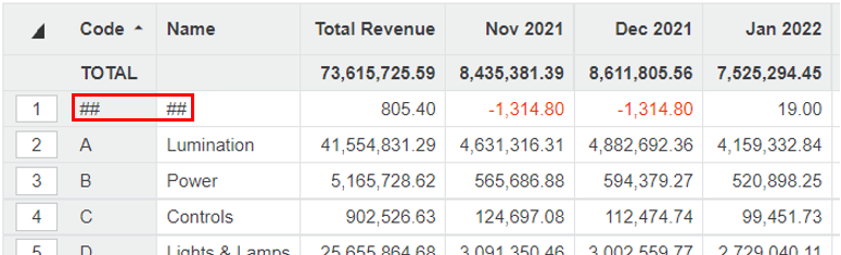 In the grid, you might see a row with ## in the first column. This string of characters is Phocas’s way of informing you that some data is missing at the source (database) level. Although the record comes from the underlying database, there’s something wrong with the way the data was recorded. This issue might arise for a variety of reasons, such as the data not being correctly allocated (categorized) against a particular dimension.