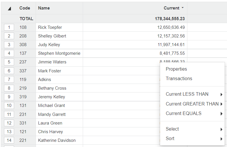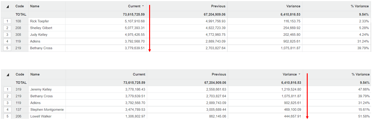 For example, suppose you are analyzing the Sales Rep data in Variance mode. By default, the data is sorted by the Current column, in descending order, so you can see the highest performing Sales Reps at the top of the grid. To see which Sales Reps have had the greatest change in performance compared to last year, sort the data by the Variance column in descending order.