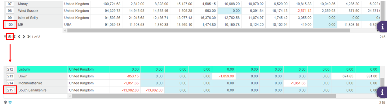 By default, if the grid contains a lot of records, there will be multiple pages in the grid, with a maximum of 100 rows on each page. Use the pagination buttons on the bottom-left of the grid to move between the pages.