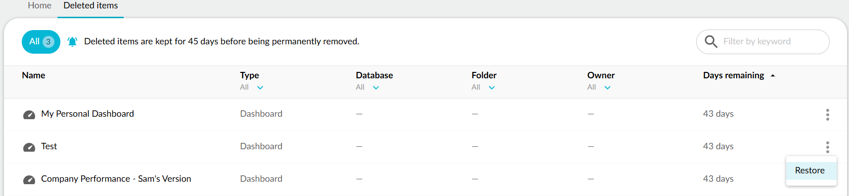 To restore an item, go to the **Deleted items** tab, click the item's kebab menu, and select **Restore**.&#x20;