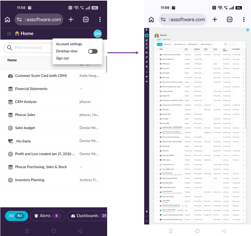 Phocas is organized into three areas: the Phocas menu, the top bar, and the content area, which initially displays your homepage. Phocas differs slightly depending on whether you view it on your desktop or mobile device.