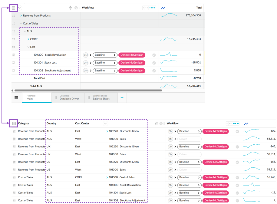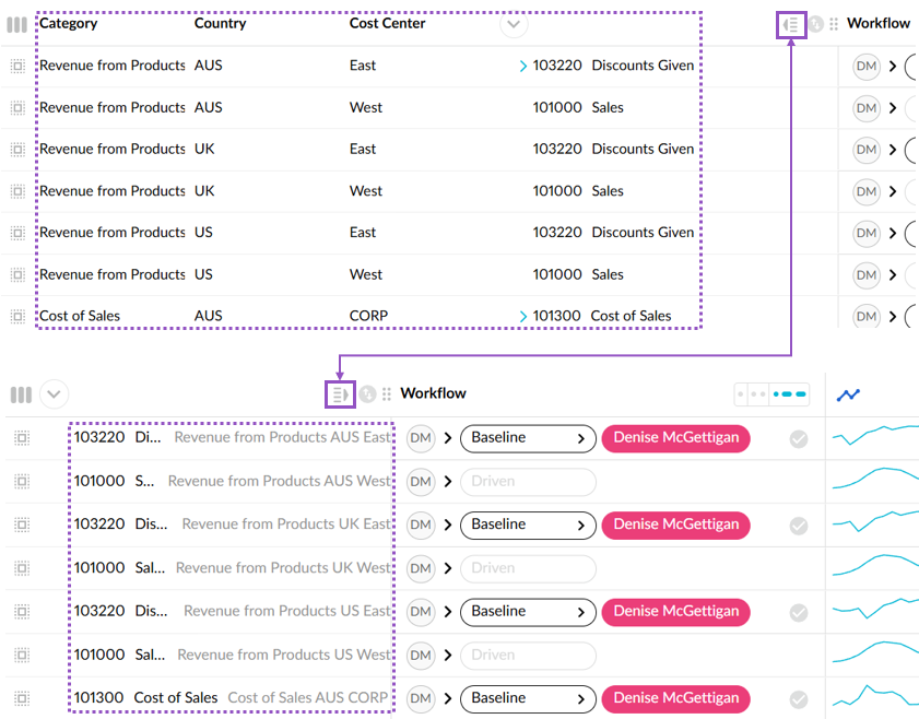 In flat view, you can hide the dimension columns to see even more data entry cells on screen, further condensing the layout. Click the Show / Hide dimension columns button near the Workflow column to show or hide those columns as required.