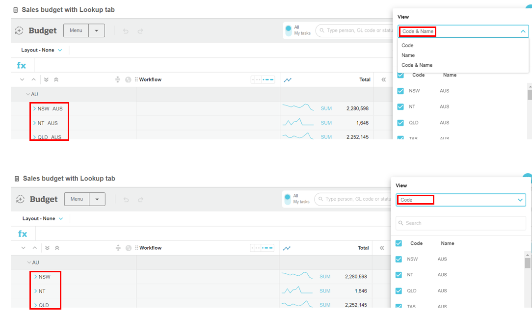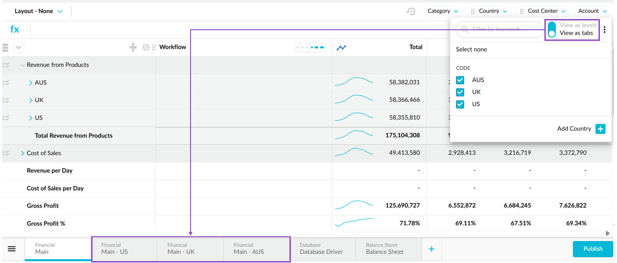 By default, the budget (Main tab) displays all selected dimension entities under their respective dimension levels. This is the levels view. You can also view the dimension entities as separate worksheet tabs, making it easier to focus on individual areas like branches, regions, or trading entities. This tabs view is especially useful when budgeting across multiple entities within the same dimension, as you can switch between the tabs for easier data entry.