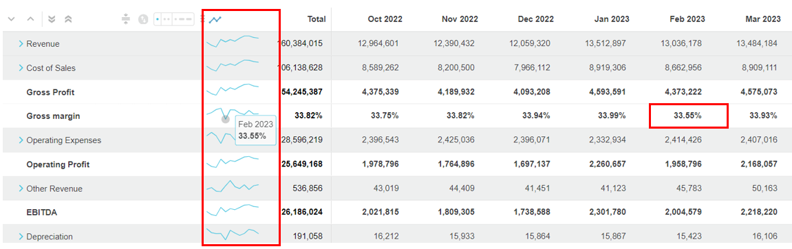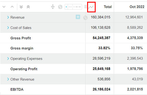 Sparklines are mini, simple line charts that display by default next to each of the values in the Total columns in budgets. Sparklines also display in forecasts but they behave in a slightly different way.