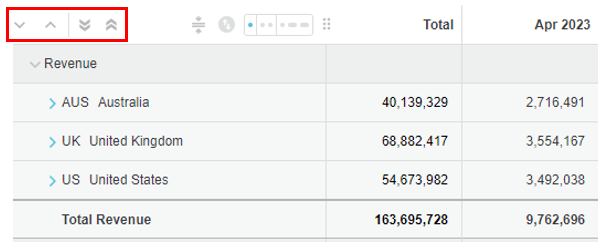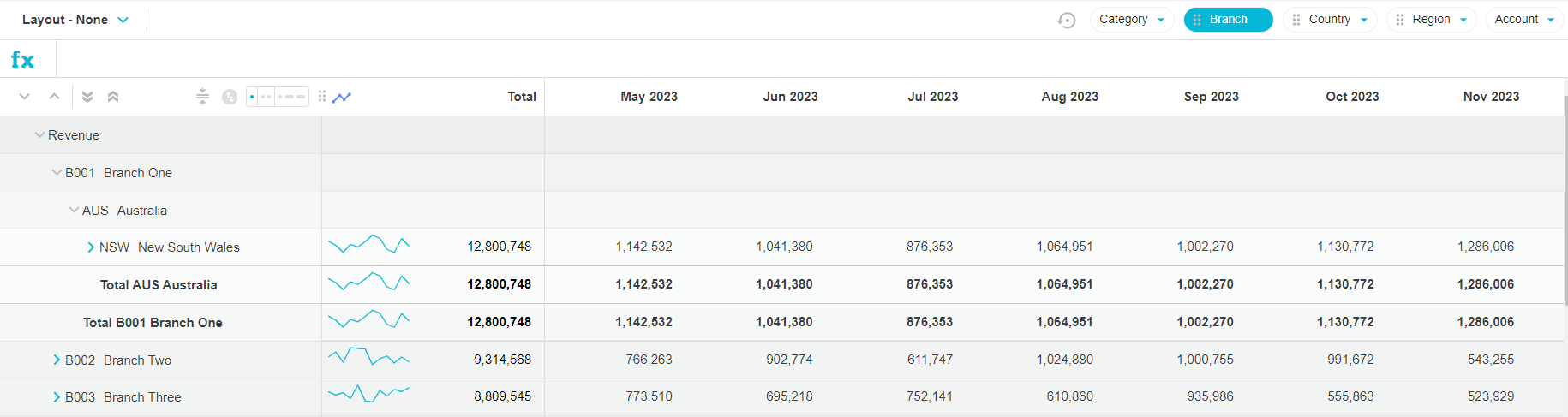 Continuing with the same budget example above, the following image shows what that budget looks like when the Branch dimension is moved before the Country dimension.