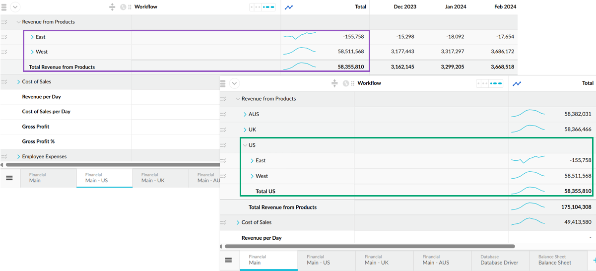 Each entity tab mirrors the Main tab, so the budgets look the same, but the entity tabs contain a subset of the overall budget values. The Main tab continues to be the consolidation of the entity tabs. Any changes to the separate entity tabs are reflected in the Main tab, and vice versa.