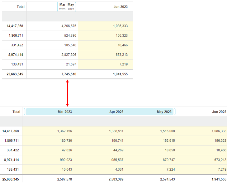 The column header of the period column group identifies the periods (columns) in that group. The values you see in a period column group are the total of the values in the individual periods.