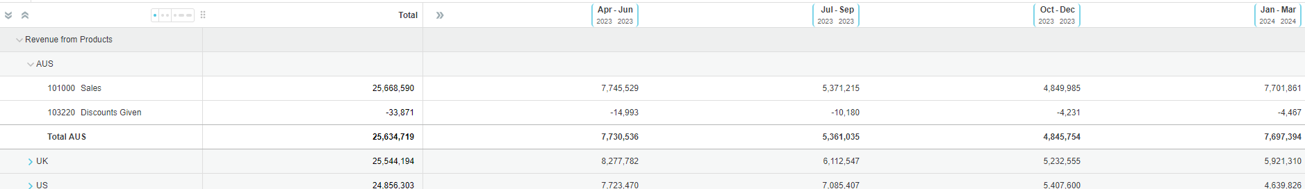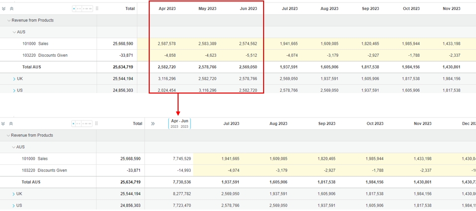 View your budget values at a summary time period level, such as quarters, and avoid the need to scroll across the worksheet.