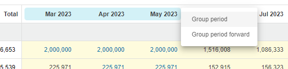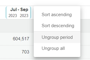 Click the header of the first period column you want to include in the group > hold and drag your mouse across the headers of the other columns you want to include in that group > release your mouse. The headers of the selected columns are highlighted blue and the grouping menu displays.