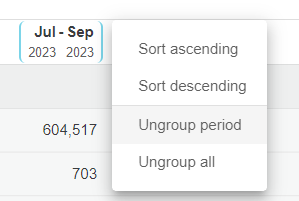 Right-click anywhere in the blue highlighted column header area and click Ungroup period to ungroup that group, or click Ungroup all to remove all groupings.