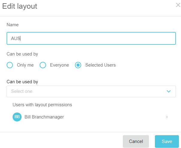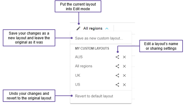You can edit the name, sharing settings and configuration of any layouts that you create. Your changes flow through to any users you have shared the layout with. You cannot edit a layout that has been shared with you. All of the editing options are available in the Layouts menu.