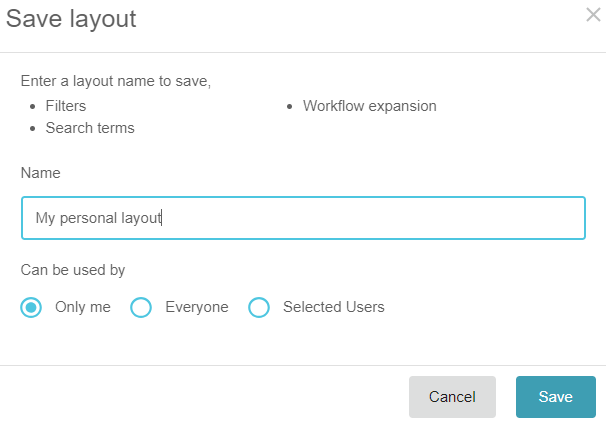 You can share a layout with one or more other users when you first save a layout or later, via the layout’s Share button. You have three sharing options: