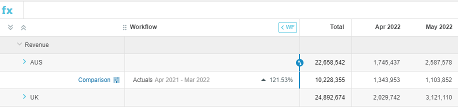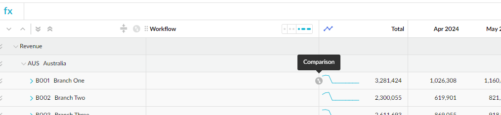 Add comparison rows to your worksheets to view comparative data alongside your budget data and help you edit those values. This information can be used in formulas or just for reference purposes.