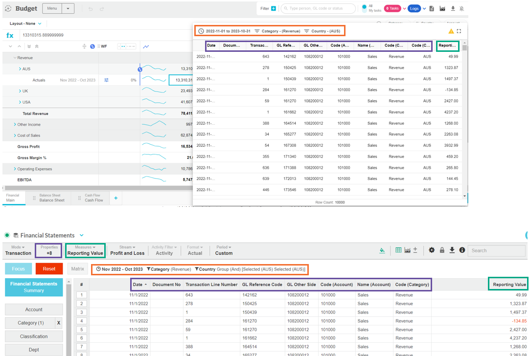 Either click the cell and click the Cell menu > Transactions or right-click the cell and click transactions. The transactions window displays all the transaction values associated with the selected value; the sum of these transaction values equates to the value you see in the worksheet cell. This is the same data that you see when you view the transactions in the database, via either Financial Statements or Analytics, as applicable. Regardless of the starting point, the transactions display in Analytics > Transaction mode. In the top-left corner, you can see the period followed by the filters that are applied. In the grid, there are columns for all the properties, along with the value, which corresponds to the selected measure. There’s a count of rows at the bottom. If a row limit is applied in Analytics, it is carried through into the Budgets & Forecasts transaction window, as identified by the warning symbol in the top-right corner.