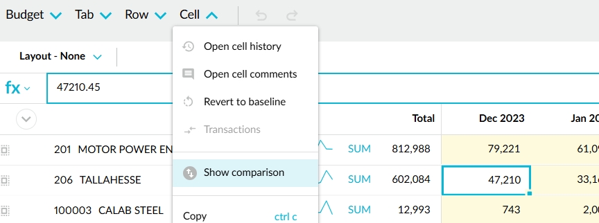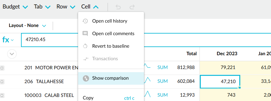 Either click the cell and click the Cell menu > Show comparison or right-click the cell and click Show comparison. This method is handy when you want to quickly view comparison data for a specific cell.