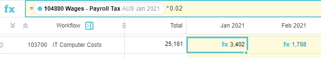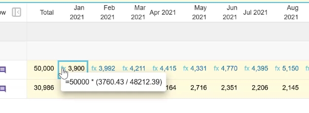 It is easy to identify and understand formulas. When a cell contains a formula, the cell value has a blue fx indicator next to it. You can hover over this indicator to view the formula or click a cell and view the formula in the fx bar.