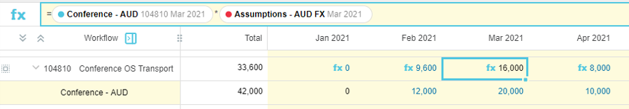 You added a Manual Entry Driver tab (which is named Assumptions) in which you entered an AUD exchange rate. You want to use that rate to calculate the budgeted cost of the Australian Conference. In the formula below, the Conference - AUD value is multiplied by the exchange rate in the Assumptions tab.