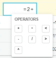 When you enter or edit an operator in a formula, a list of available operators displays. You can either use this list as a reference, so you know which operators you can use, or click the required operator to insert it into the formula.
