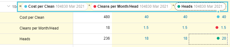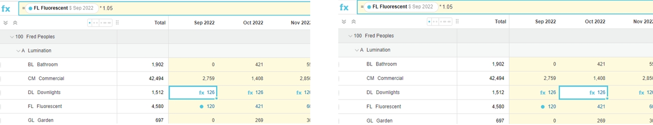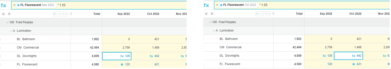 In the following example, the formula in DL > September 2022 cell references the value in the FL > September 2022 cell. When that formula is copied into the next cell, the reference is relative (the month changes), so the reference part of the formula changes to become FL > October 2022.