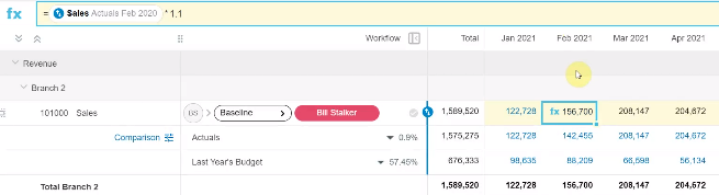 You want the Sales budget values for this year to be ten percent higher than last year’s actuals. In the formula below, the April 2021 sales value is made up of the actual value from 2021 plus ten percent.