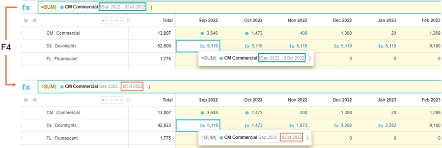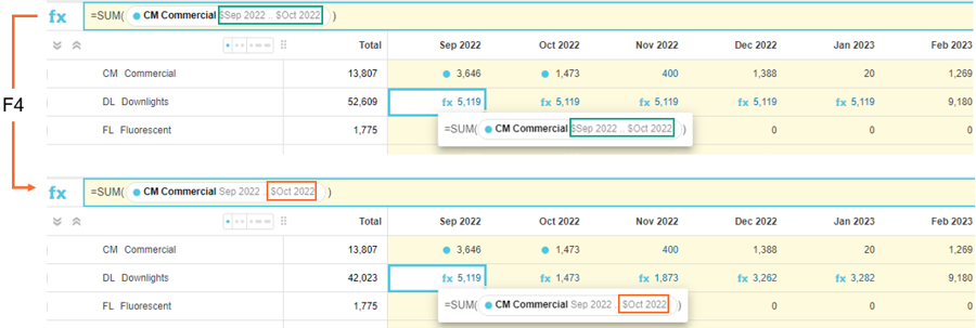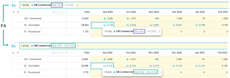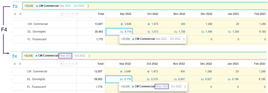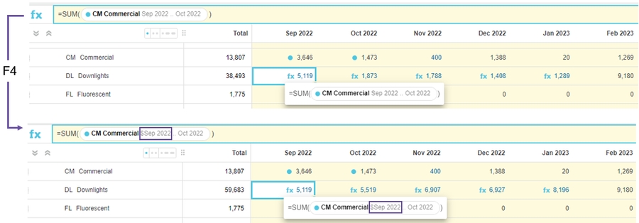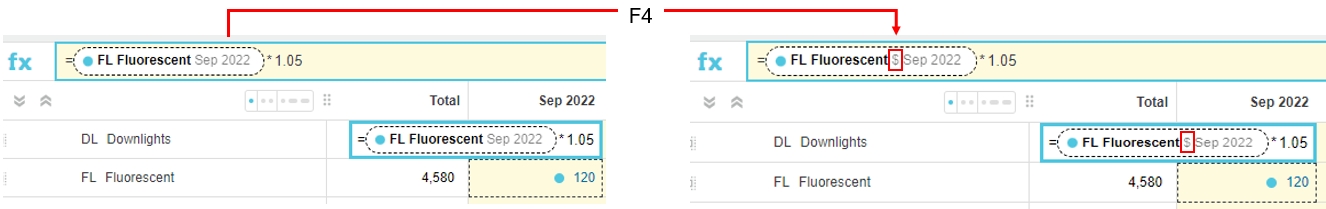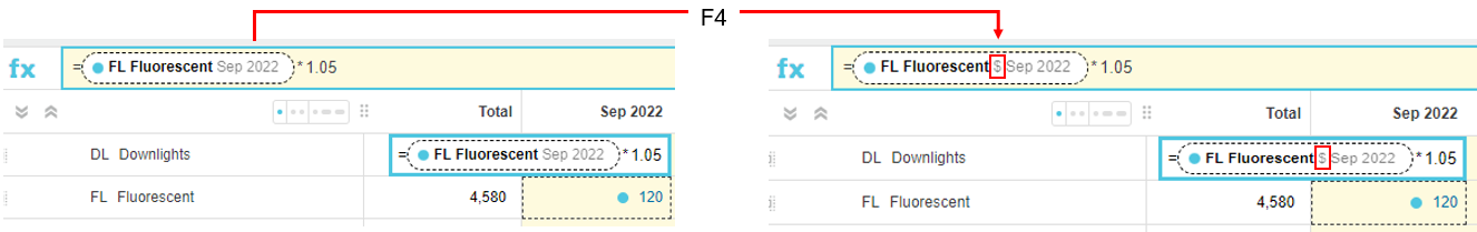 You can change the default relative references listed above to absolute references (see next section below). Following on from the example above, if you manually switch to absolute referencing, you can see the dollar sign in the formula denotes the absolute reference, and the reference part of the formula is the same in both cells; FL > September 2022.