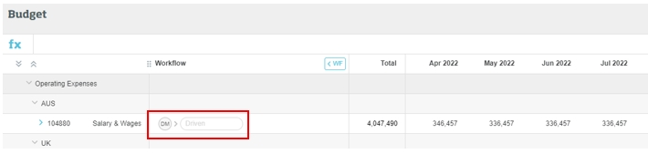 On the Main tab, you can view the automatically-driven budget values for the General Ledger account codes that are mapped to the Headcount driver. Either expand the applicable category or search for a specific General Ledger account row to confirm it is being driven - the “Driven” message displays in the Workflow column.