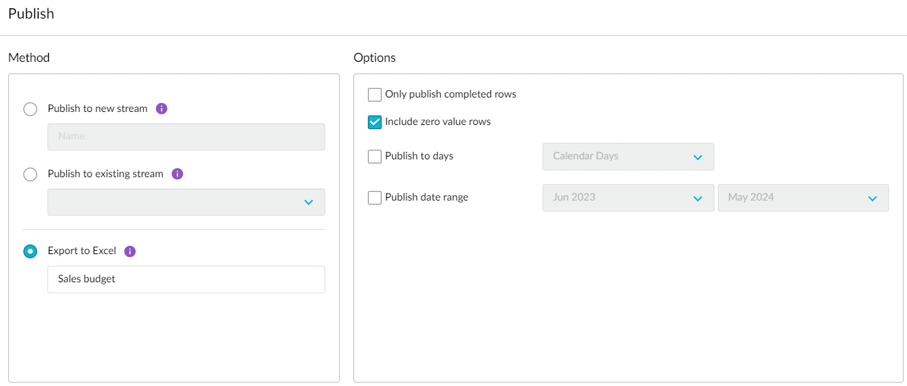 In the bottom right of the worksheet tab, click the Publish button, then select Export to Excel. Edit the default file name and select the applicable publishing options.