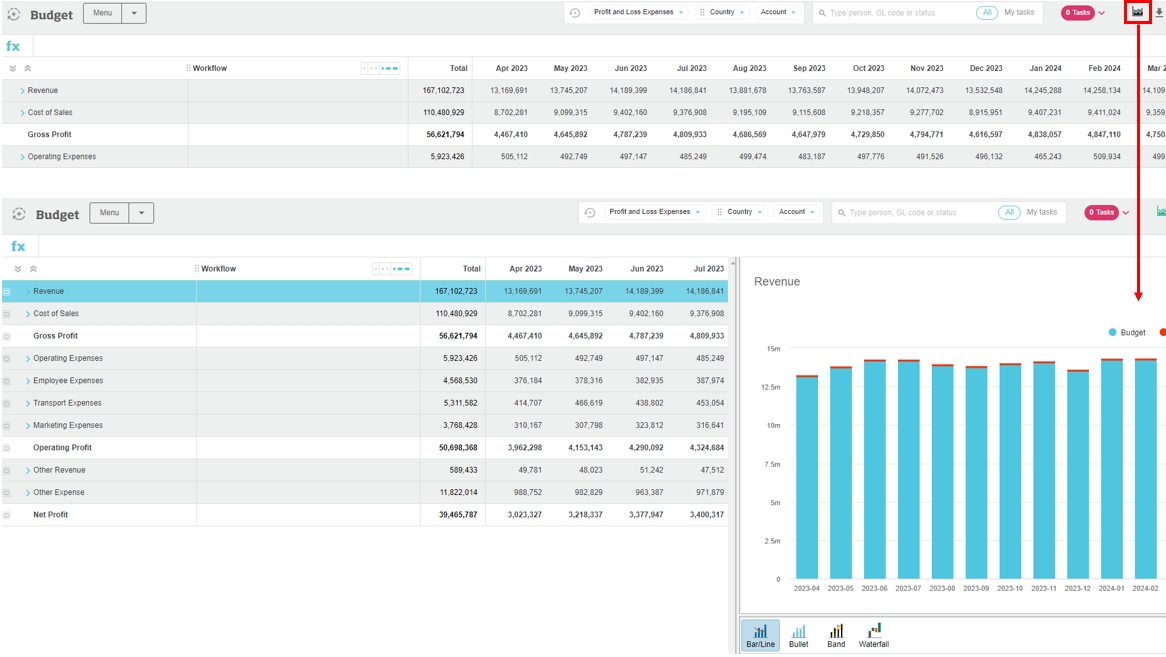Scroll across the grid to view the data on the far right whilst keeping the chart in view. If you want a better view of the grid and a minimal view of the chart panel or vice versa, click and drag the divider to the left or right as required.