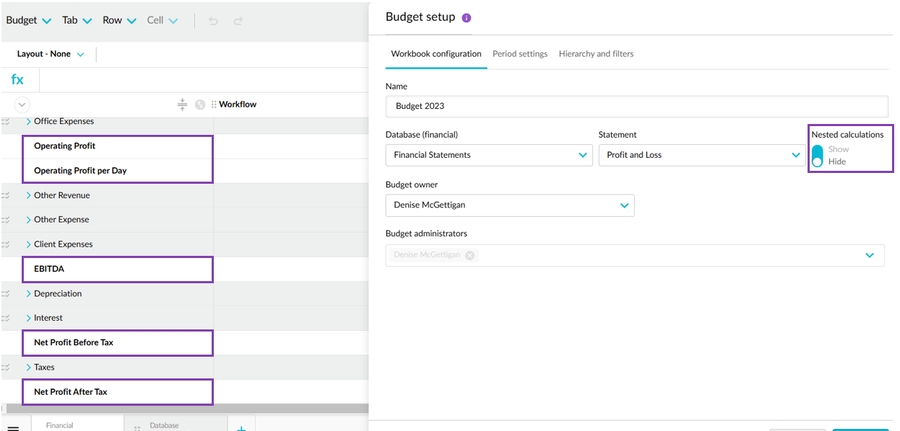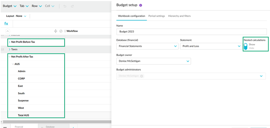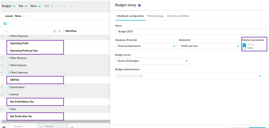 To show these rows in the budget, go to the workbook or tab setup and switch the Nested calculations setting to Show, as in the image on the right image in the table below.