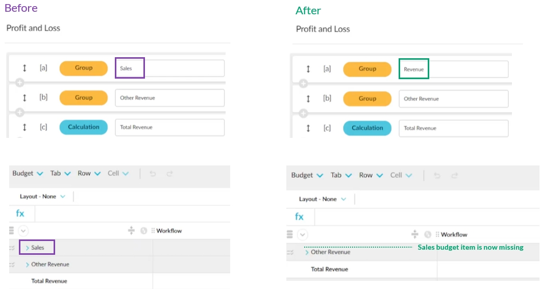 Suppose that in a Profit and Loss statement, you have an account group called Sales. When you create a budget based on that statement, you’ll see the Sales group in the worksheet. If you later change the name of that group to Revenue (see customize account groups in FS), you’ll lose your budget values against the Sales group. The Sales group is no longer displayed in the budget because you've broken the connection between that dimension entity in FS and B&F.