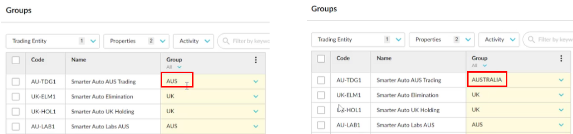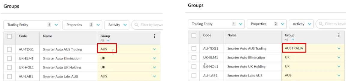 As in example 1 above, if you rename a dimension entity (see Manage dimension groups in FS), that item will no longer be displayed in the budget in B&F. In the example below, changing the name of the dimension entity assigned to the Smarter Auto AUS Trading Entity will result in that trading entity being missing from the budget. Again, you can get it back into the budget by reverting to the original dimension entity name.