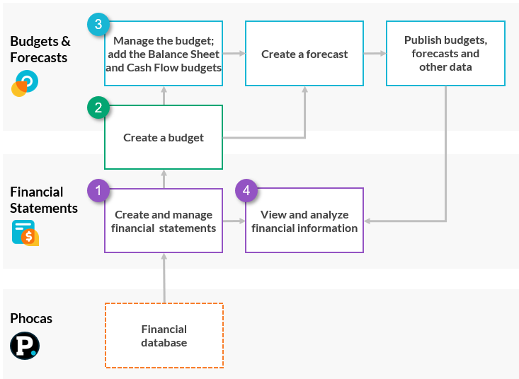 Although Financials Statements (FS) and Budgets & Forecasts (B&F) are available as standalone modules, they are interdependent. When used together, these modules provide a Financial Planning and Analysis solution. The following diagram illustrates the workflow between the two modules.