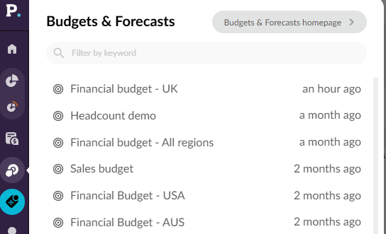 Your budget or forecast workbooks are accessible from both your Phocas homepage and side navigation menu (Budgets & Forecast menu and Recents menu lists). Budgets & Forecasts also has its own homepage.