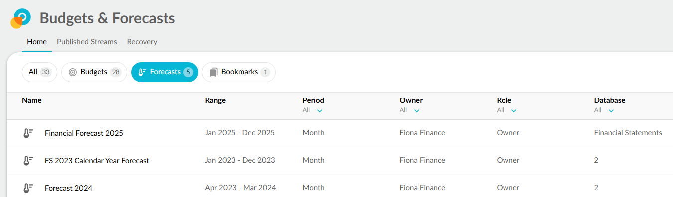 You can also quickly access your forecast workbooks from your Budgets and Forecast homepage. Click the Forecasts button to filter the list and see only the forecast type of workbooks.