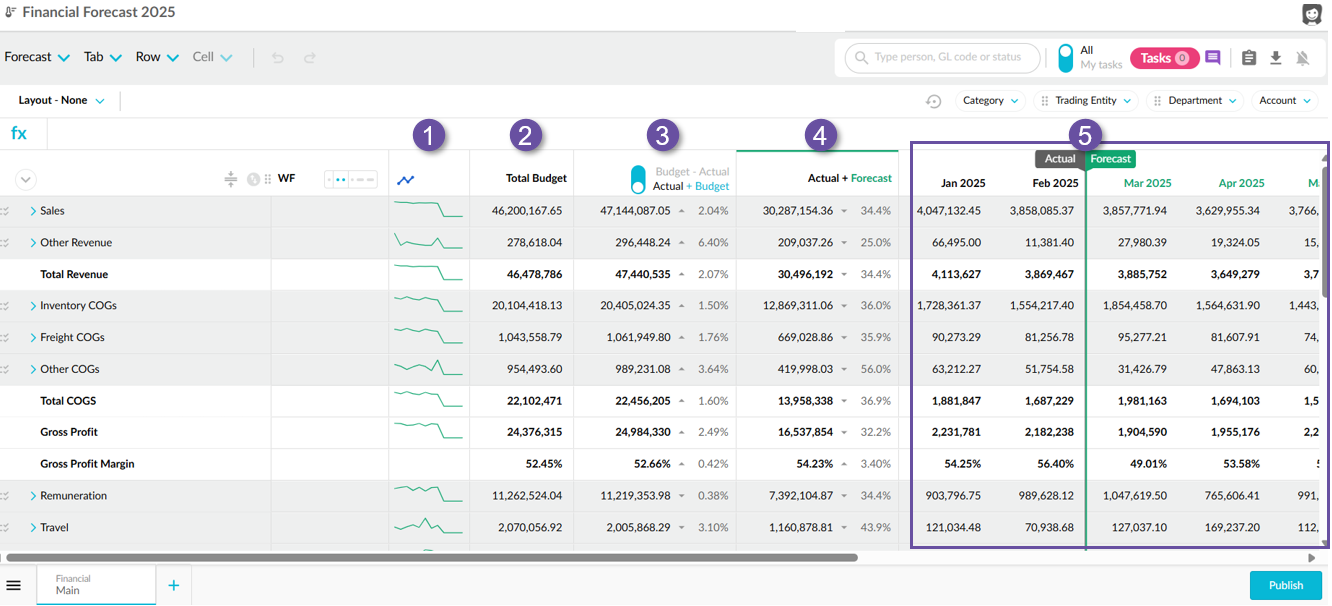 In the grid, the forecast cells are editable, making this the main workspace for reforecasting. You can enter the most recent forecasted figures, reflecting updates based on actual performance and anticipated changes.