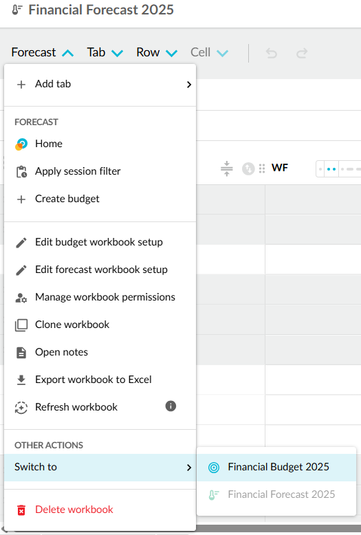A forecast is always based on a budget. The budget owner creates the forecast by saving a budget workbook as a forecast workbook. You can then quickly switch between the budget and forecast workbooks via the Budget menu in the top left corner.