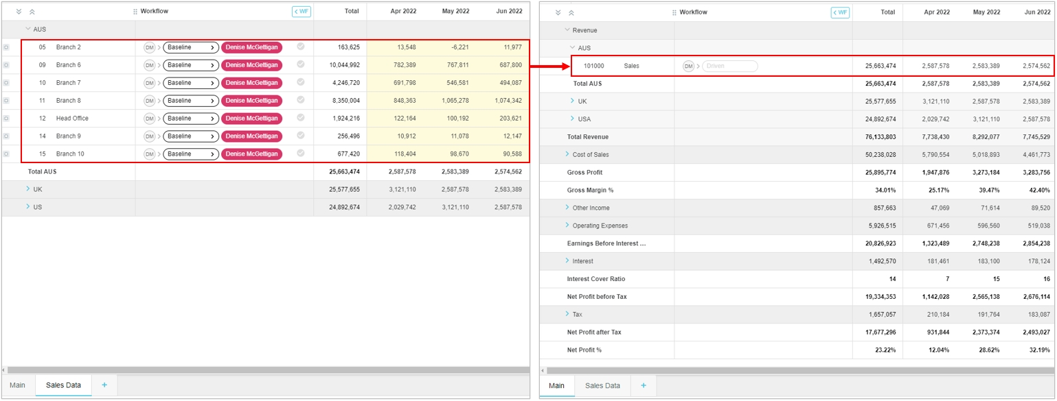 As mentioned above, some tabs drive budget values. Drivers, also referred to as assumptions, are used in most budgets. They are key business factors that influence financial performance, such as operational costs. These factors often change during budgeting, so managing them in additional tabs can be useful. Drivers act like powerful working lines. You do all the data entry budgeting in the driver tab, and the data flows into the Main tab, sometimes automatically, as illustrated in the image below. When you change the data in the driver tab, the data in the Main tab updates accordingly. Using driver tabs saves you a lot of time when it comes to updating budget data.