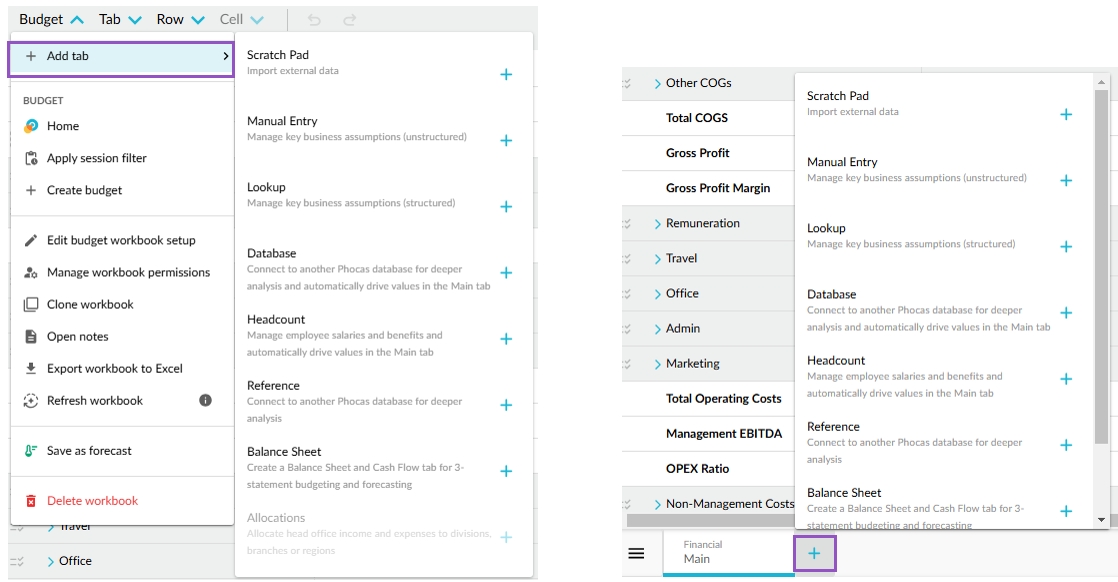 Either click the Budget menu > Add tab or click the Add tab button (at the bottom of the workbook), then select the required tab type and proceed to set up the tab.