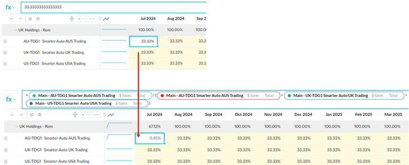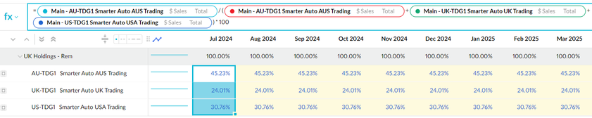 Edit the percentages as required. In the example below, you enter a formula into the first period cell of the AUS Trading row that references the sales values in the Main tab to calculate the AUS Trading sales as a percentage of total revenue. Australia, the UK plus US plus Australia.