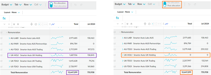 For example, in the image below, in pre-allocation mode, the total remuneration is $12.6 million, with $1.6 million for UK Holding. In post-allocation mode, the total remuneration remains the same but there’s nothing in for UK Holdings, as it's now sitting in equal proportions with the three trading entities.