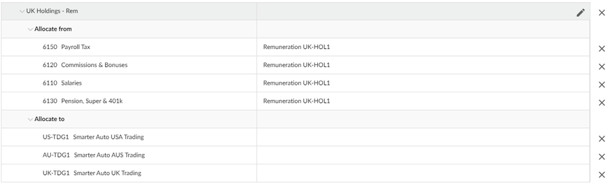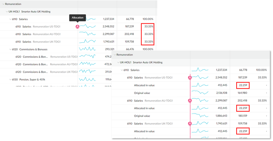 In group allocations, this tab might be useful for troubleshooting purposes but typically, you won't need to use it often. For example, in the image below, the group is allocating everything evenly. Taking a closer look at the first row, you can see that in July, the UK holding entity has $666,778 for salaries (100%) which will be allocated evenly to three trading entities, each one getting 33%. To see exactly how much each of the UK holding salaries entity will get, hover over the border line on the left of the Total column and click the pink Allocation button that displays. Because, in this case, the salaries are being allocated evenly, each entity will get 22,259 to add on top of their original budgeted salaries.