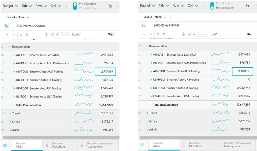 Back on the Main tab, the changes are automatically reflected in the post-allocation values. For example, the pre-allocation remuneration value for AUS Trading is 2,717,099, but in post-allocation mode, it is 3,480,113 (the pre-allocation value plus 45% of the UK Holdings remuneration costs).
