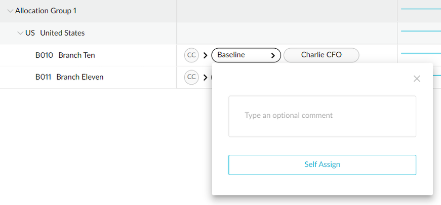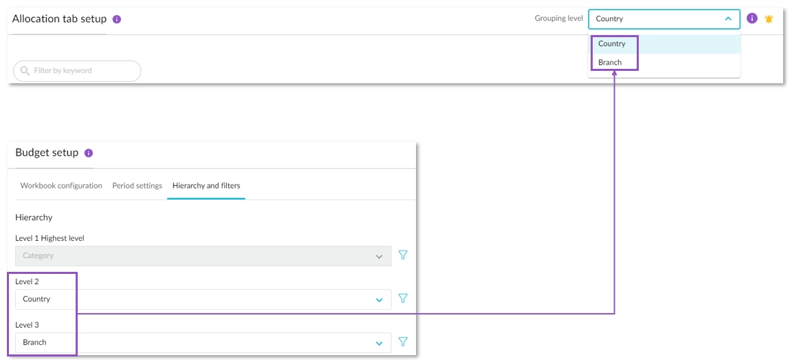 Allocation groups sit at a specific dimension level. The levels correspond to those in the workbook setup. If you have multiple hierarchy levels in the workbook, you must specify this level before adding any allocation group rules.