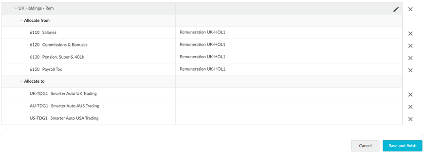 Grouped (recommended): Allocates a group of accounts in the same way. The source account matches the destination, for example, the allocation of the Head Office Remuneration account to the remuneration accounts of each branch.