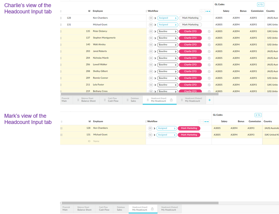 Access to the data. Even if a user has access to the Headcount Input tab, they can only see the rows to which they are assigned in the workflow.